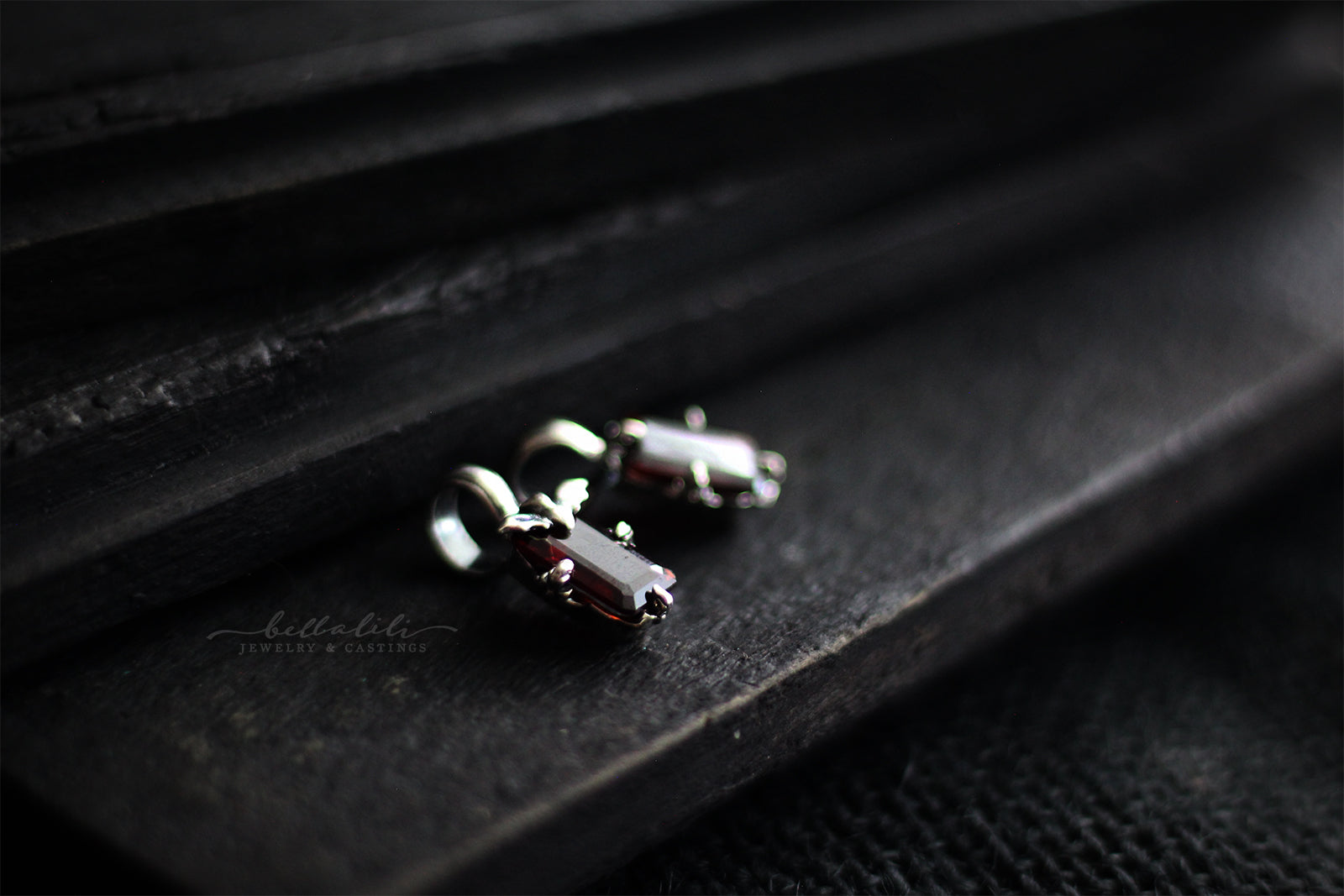 Each charm cradles a natural garnet, a deep wine-red ember held in my signature Art Nouveau three-leaf prong setting. I sculpted these settings in ZBrush, 3D printed the masters, then had them cast in sterling silver before finishing each one by hand.