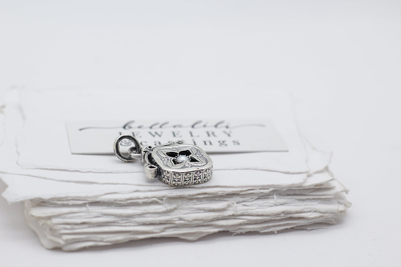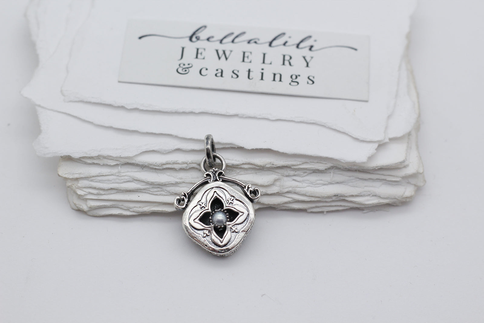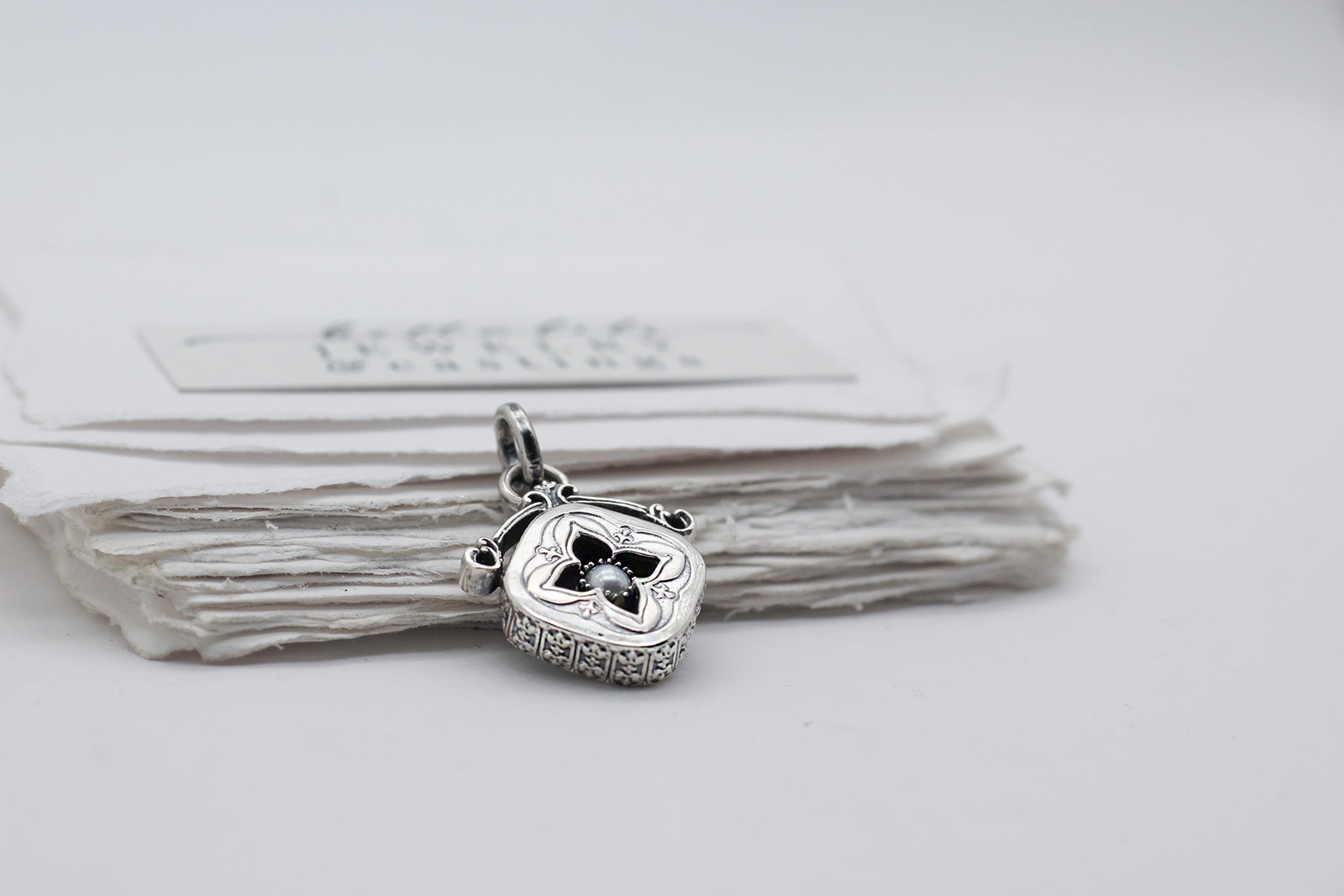A small freshwater pearl rests at the center of a rounded square pendant framed by a four pointed window. I engraved the design into steel, then rolled reclaimed sterling through the mill so the pattern rises softly around the opening. The pearl sits in a tiny bezel at the heart of the piece, a quiet circle of glow against the darkened interior, with delicate wire curls at the shoulders that feel like hinges and ironwork from a miniature gate. At about six grams of silver and roughly 1 inch tall including the bail by 7/8 inch wide, it wears like a little protective charm rather than ordinary jewelry.