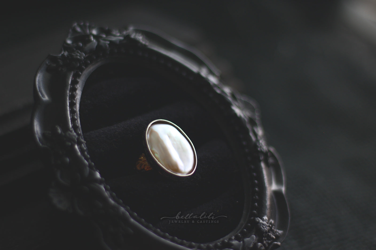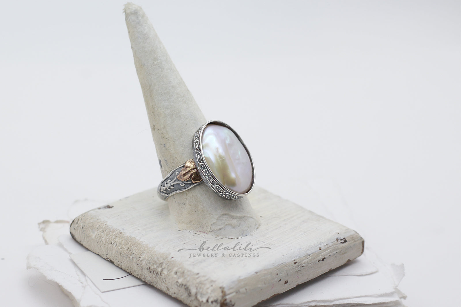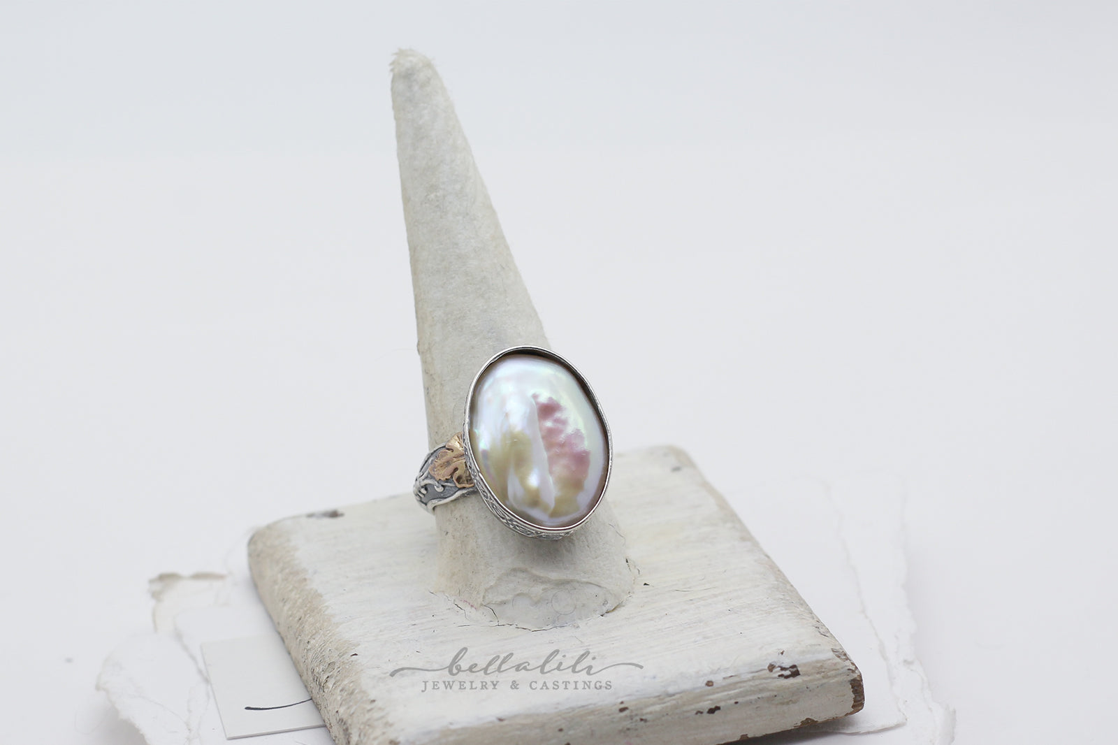 An enormous AAA freshwater pearl, roughly 1 inch tall by 3 quarter inch wide, rests at the center of this ring. The surface glows with soft luster and shifting color, whites and blush tones moving like clouded light on water. I set the pearl in a hand built sterling bezel, the band shaped with quiet ornament and accented by two small fourteen karat gold filled leaves at the sides. It feels like something kept in a velvet lined box in an old stone house, a ring that turns the hand into a small scrying pool of light.