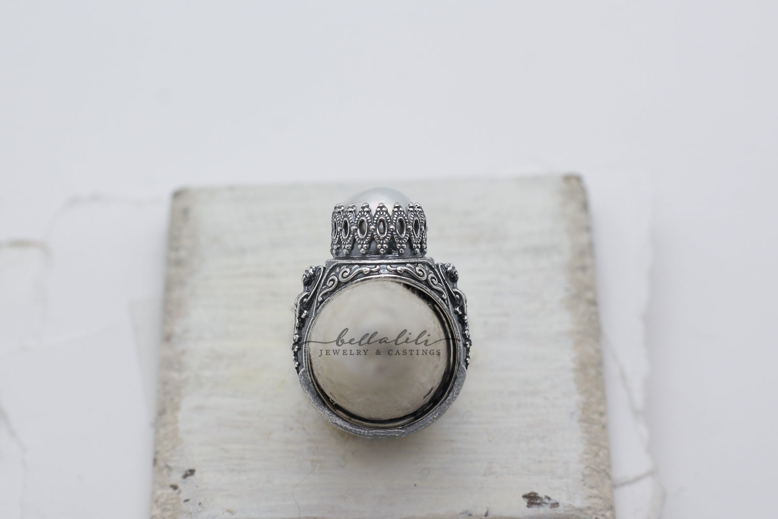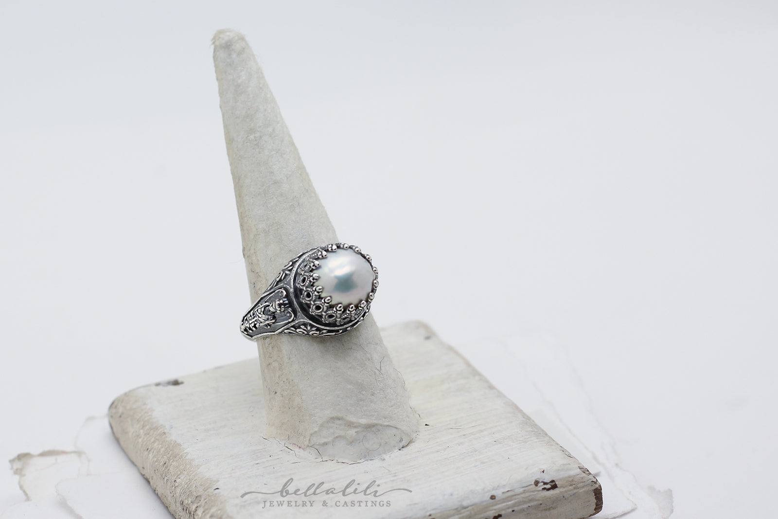 A freshwater pearl sits at the center of Ivoryn, a round glow held in a hand built sterling setting. The surface of the pearl shifts softly between white and faint blush tones, like light on still water. I set it in a smooth lace bezel on a solid silver band so the pearl feels calm and deliberate, a single pale circle that draws the eye without shouting. At nine grams of metal the ring has a reassuring weight in the hand, substantial without feeling heavy.