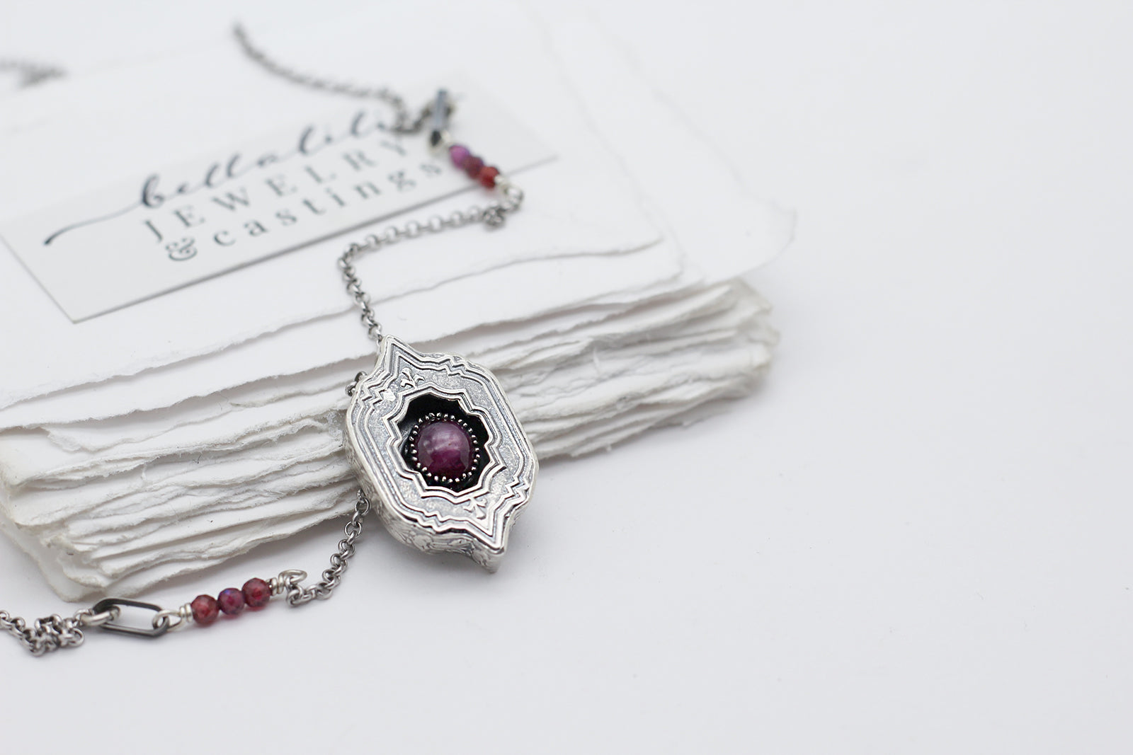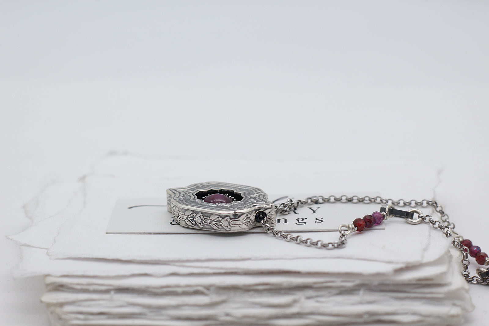 A natural star ruby cabochon sits at the center of this tall Rowenstar shadowbox, a deep cranberry stone held in an ornate window of sterling. Under strong light a soft star drifts across the surface, a quiet enchantment that comes and goes as you move. I engraved the frame into steel, then rolled reclaimed silver through the mill to raise the pattern before cutting and shaping the pendant by hand. At ten grams of sterling it has a solid, reassuring weight, the largest of the berry toned windows in this release.