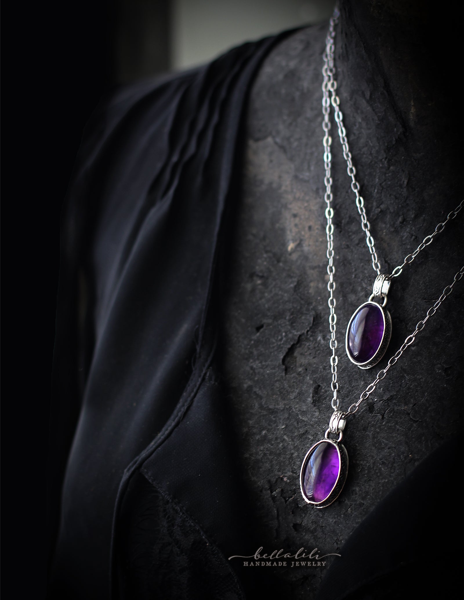 Natural African amethyst cabochon in a hand built recycled sterling setting with a custom decorative bezel, embossed swirl back, patterned bail, and a decorative BellaLili logo plaque on the reverse. Polished to a high shine inside the setting to reflect light and showcase the stone.