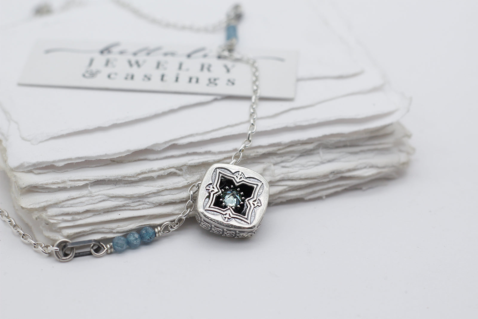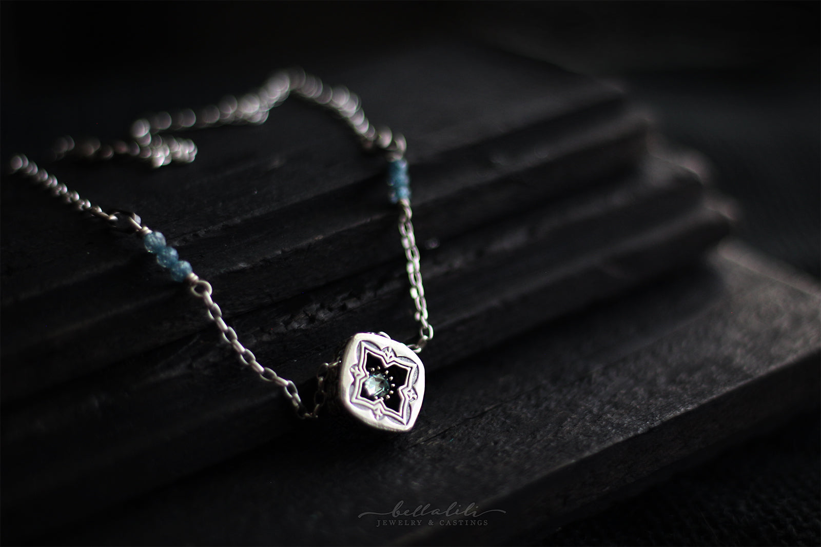 A round blue green moissanite rests at the center of a square window shadowbox, framed in pointed arches that feel like a small shard of cathedral glass rescued from the elves abandoned chapel. I engraved the pattern into steel, then rolled reclaimed sterling through the mill to raise the design, cutting and shaping the box by hand before setting the stone in its dark little well.