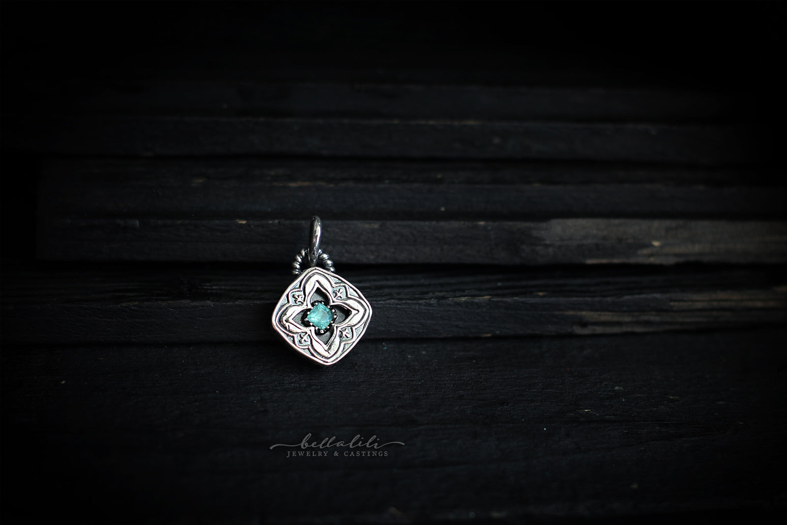 A petite 0.35 ct cushion cut Madagascar grandidierite, translucent and vibrant sea green. Set in a hand crafted sterling shadowbox with a window to peer into the gem’s depths. Pairs beautifully with the sea green CZ beaded necklace. necklace.