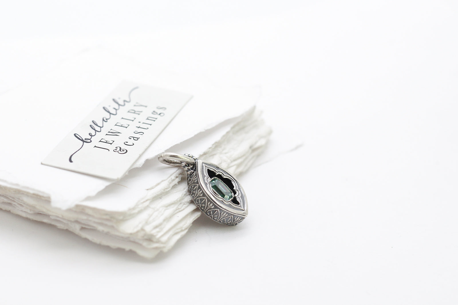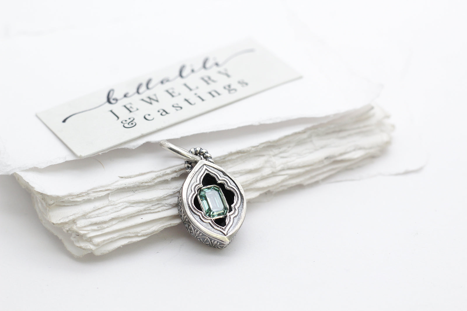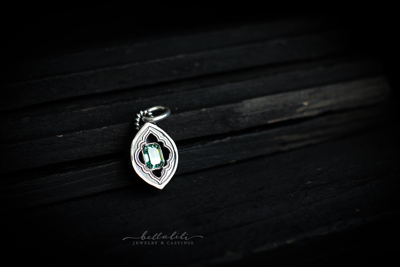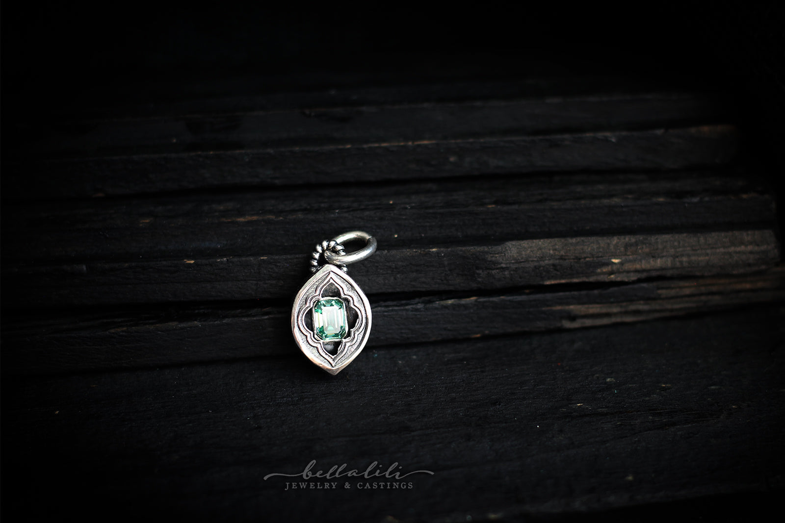 An emerald cut moissanite in lovely sage green rests within a hand crafted sterling shadowbox. A tiny crescent moon adorns the back, a private benediction. A small window invites a quiet gleam, the color steady as leaf light.