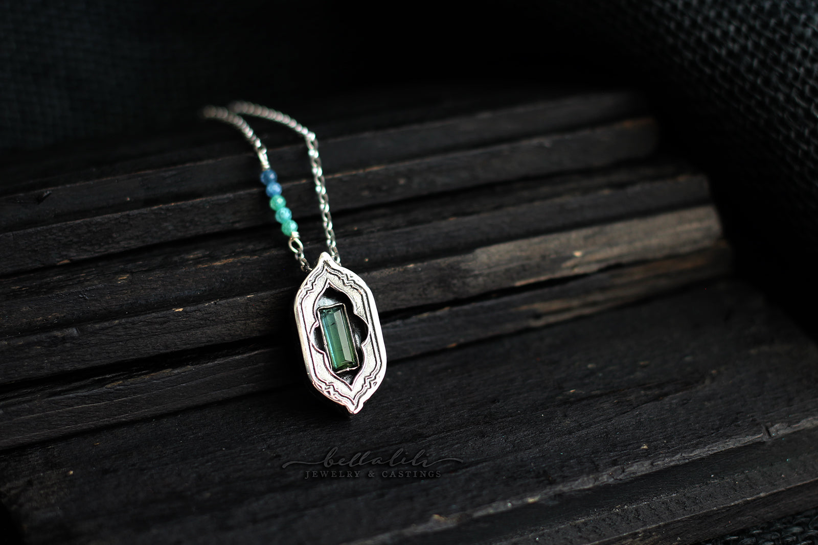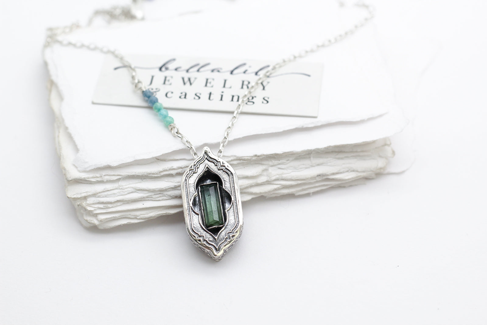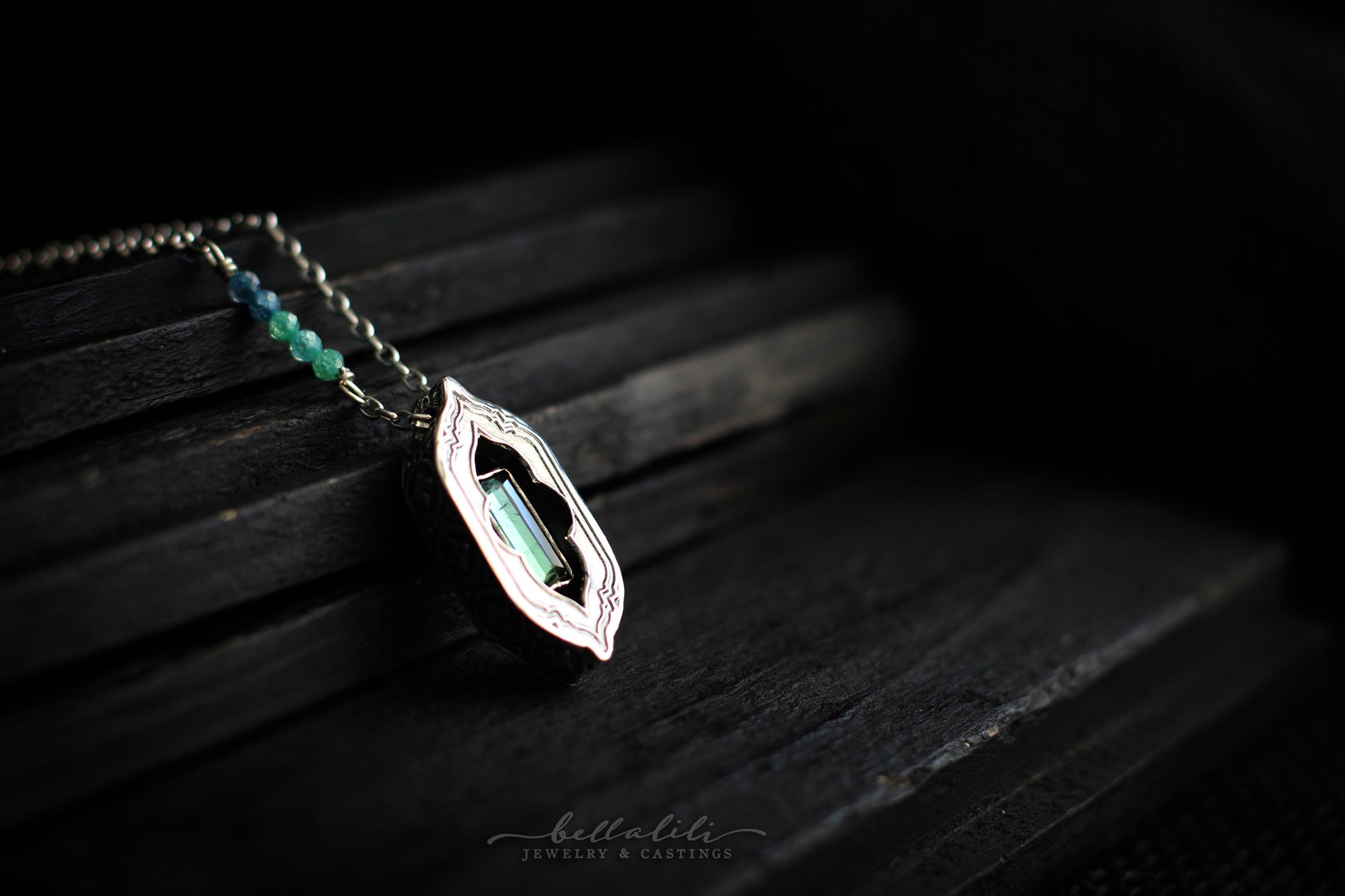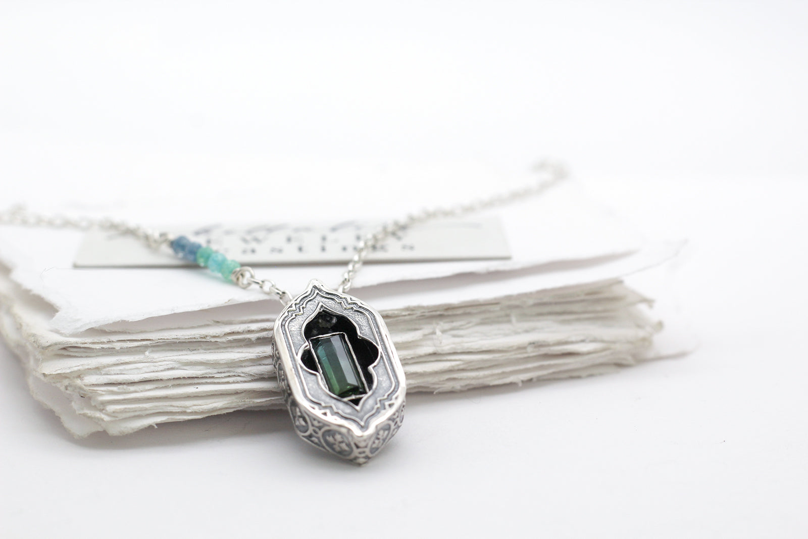 A 2.2ct step cut baguette tourmaline, bicolor from green to blue, rests in a hand crafted sterling shadowbox with a window to peer into the gem’s depths. Largest of the set, it carries a 20" chain with an ombre CZ beaded accent, bright as leaf light meeting sky. The color turns softly as you move, calm and precise.
