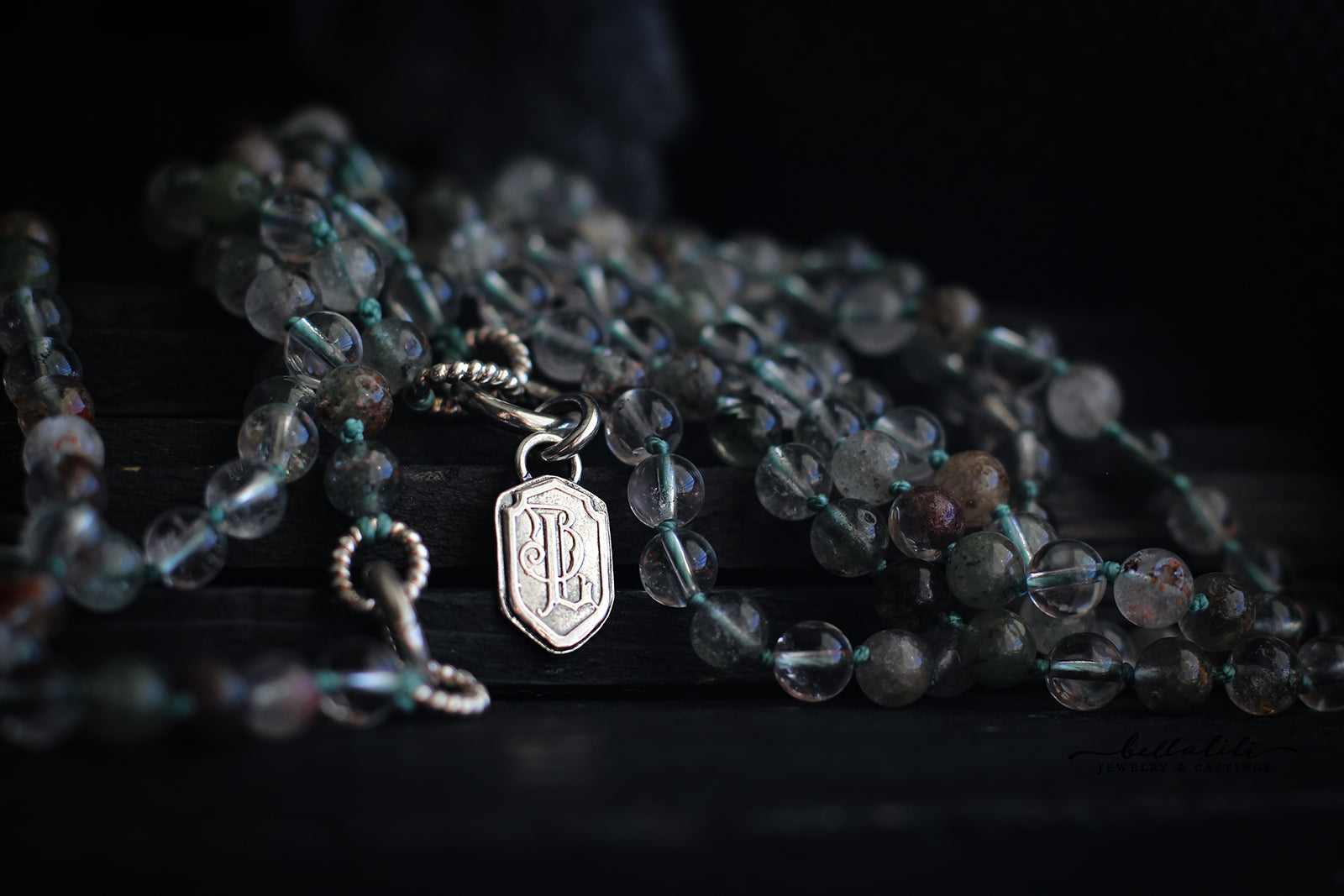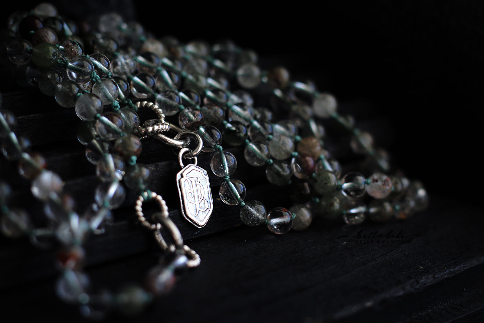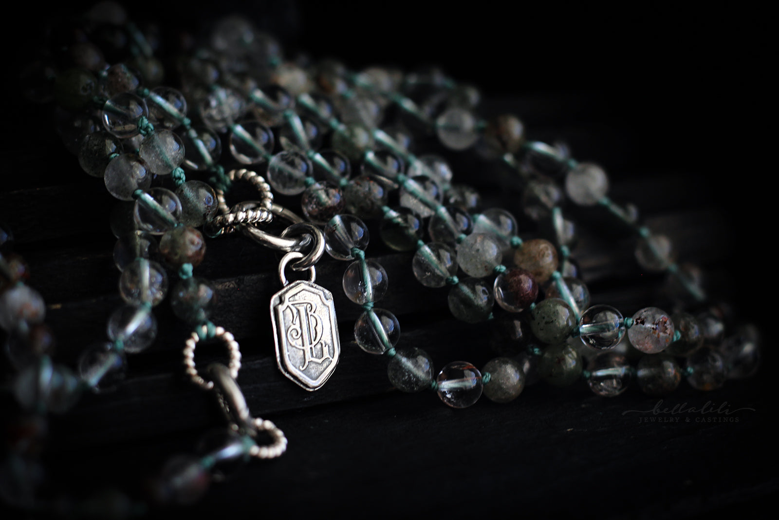 Green phantoms drift inside clear quartz, like cliffs reflected in quiet water. Each 6 mm bead is hand knotted for a soft drape and calm movement. A hidden sterling clasp rests at center, ready to carry a pendant or charm when you wish.