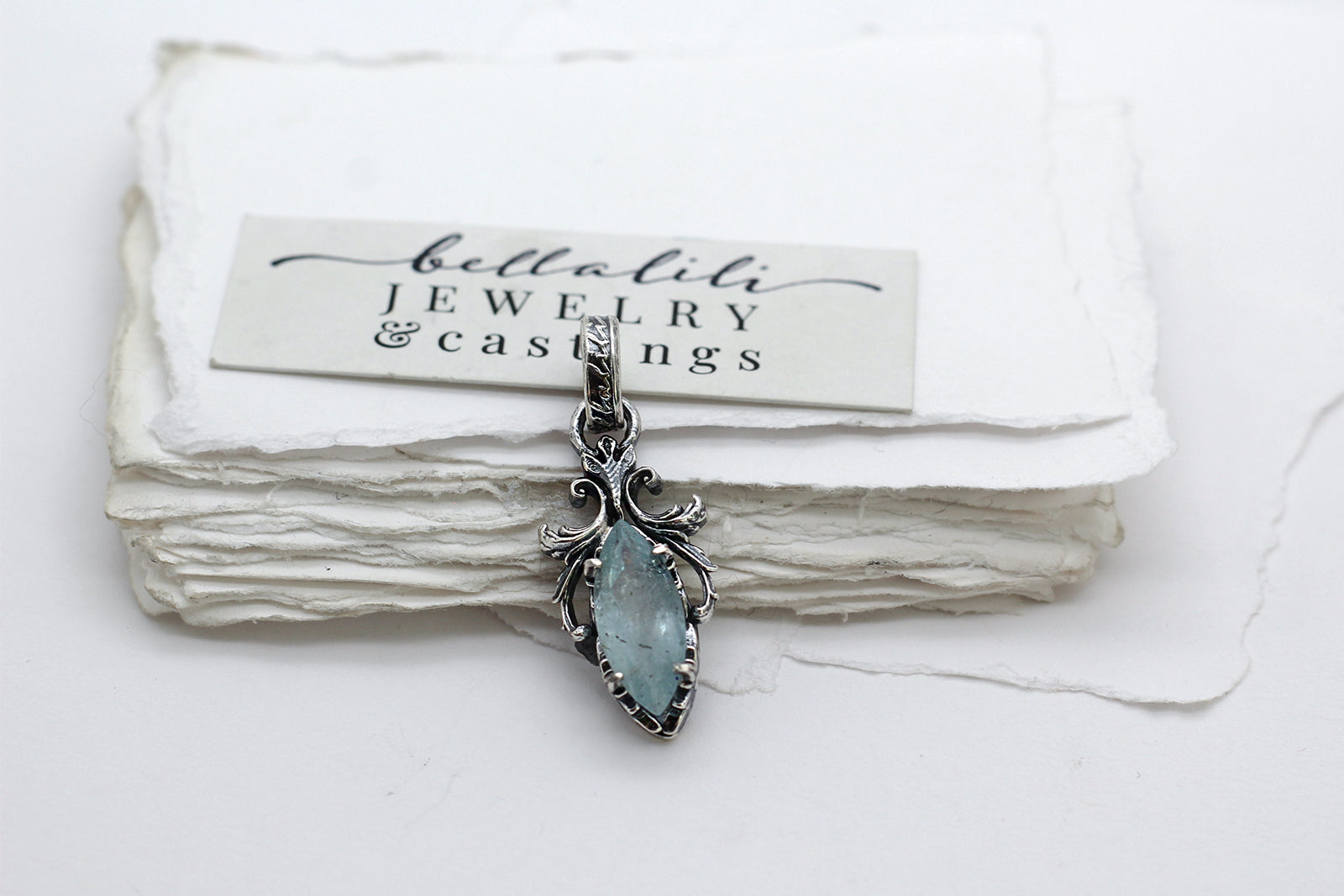 Santa Maria aquamarine with rainbow inclusions, marquise cut, alive with shifting light. Set in hand crafted sterling, balanced between leaf prongs, with an open back to let the light in. Chains are sold separately so you can build the story you like.